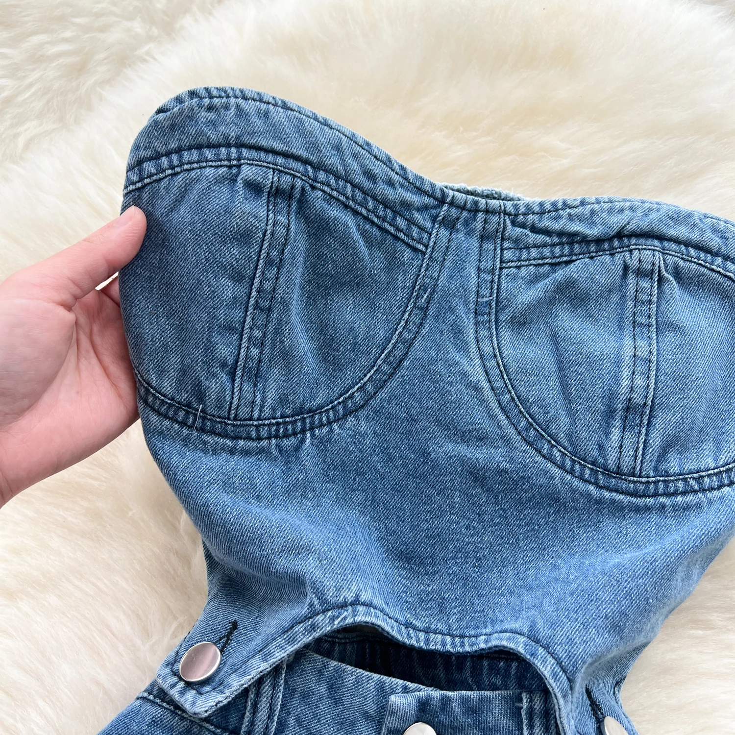 Turn heads this summer with this vintage-inspired strapless denim jumpsuit — where bold meets classic. Designed with a flattering hollow-out detail, wide-leg silhouette, and mid-waist fit, this full-length romper delivers effortless edge and elegance in one sleek look.